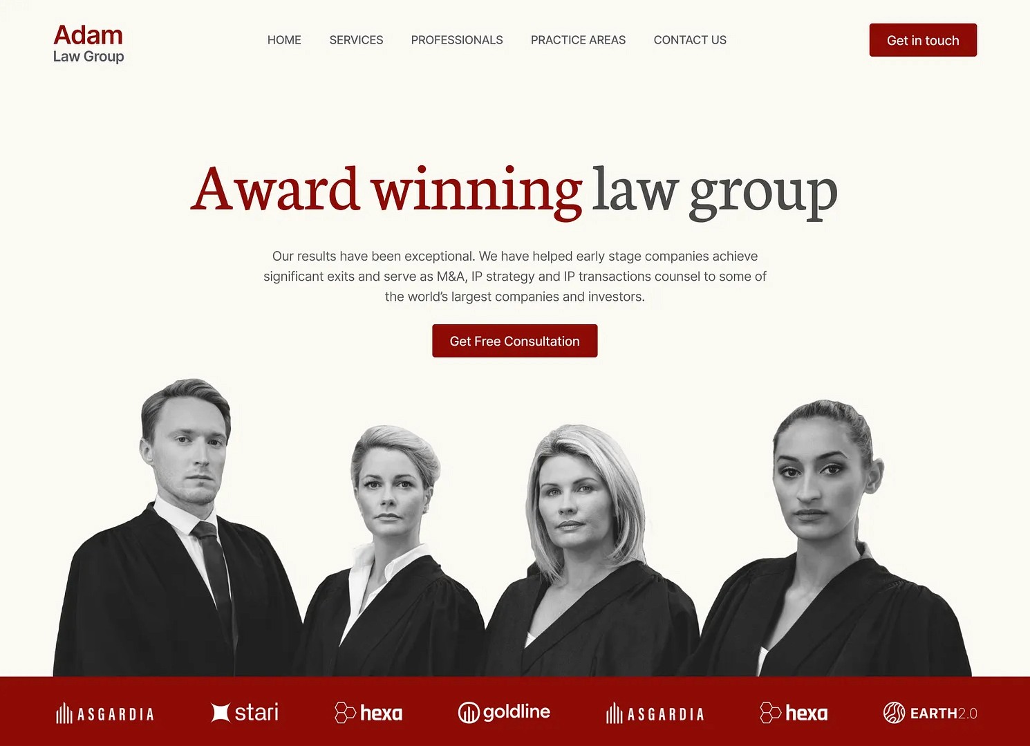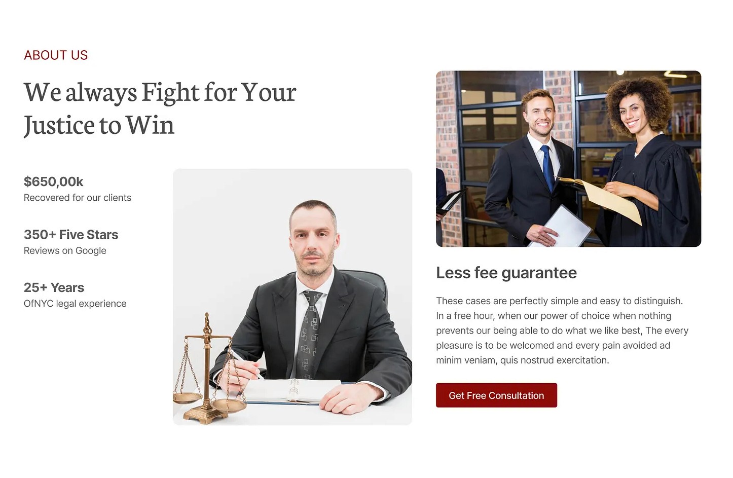 This law firm website was designed to communicate authority, professionalism, and trust through a structured, editorial-style layout. Bold serif typography, neutral tones, and strong imagery create an immediate sense of credibility. The hero section highlights the firm’s reputation while guiding visitors toward consultation actions with clear, strategically placed calls-to-action.