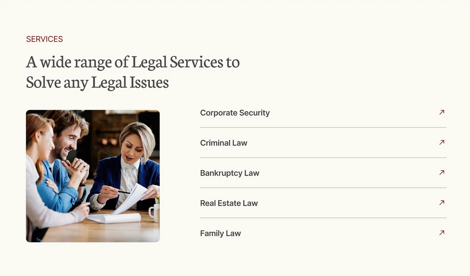 The page structure emphasizes clarity and confidence. Practice areas are organized through simple, scannable sections while trust indicators, experience highlights, and professional photography reinforce credibility. Clean spacing, strong typography, and restrained color accents maintain a refined, authoritative visual presence throughout.